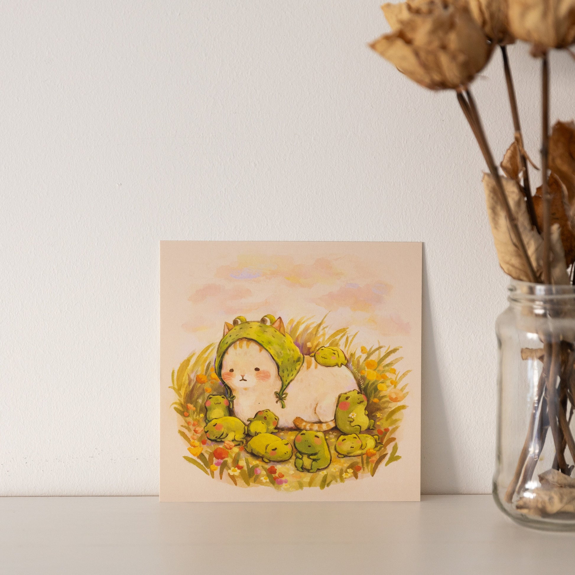 square print // "Cat & frogs" design - sleepy frog, cat in disguise | illustration, art print